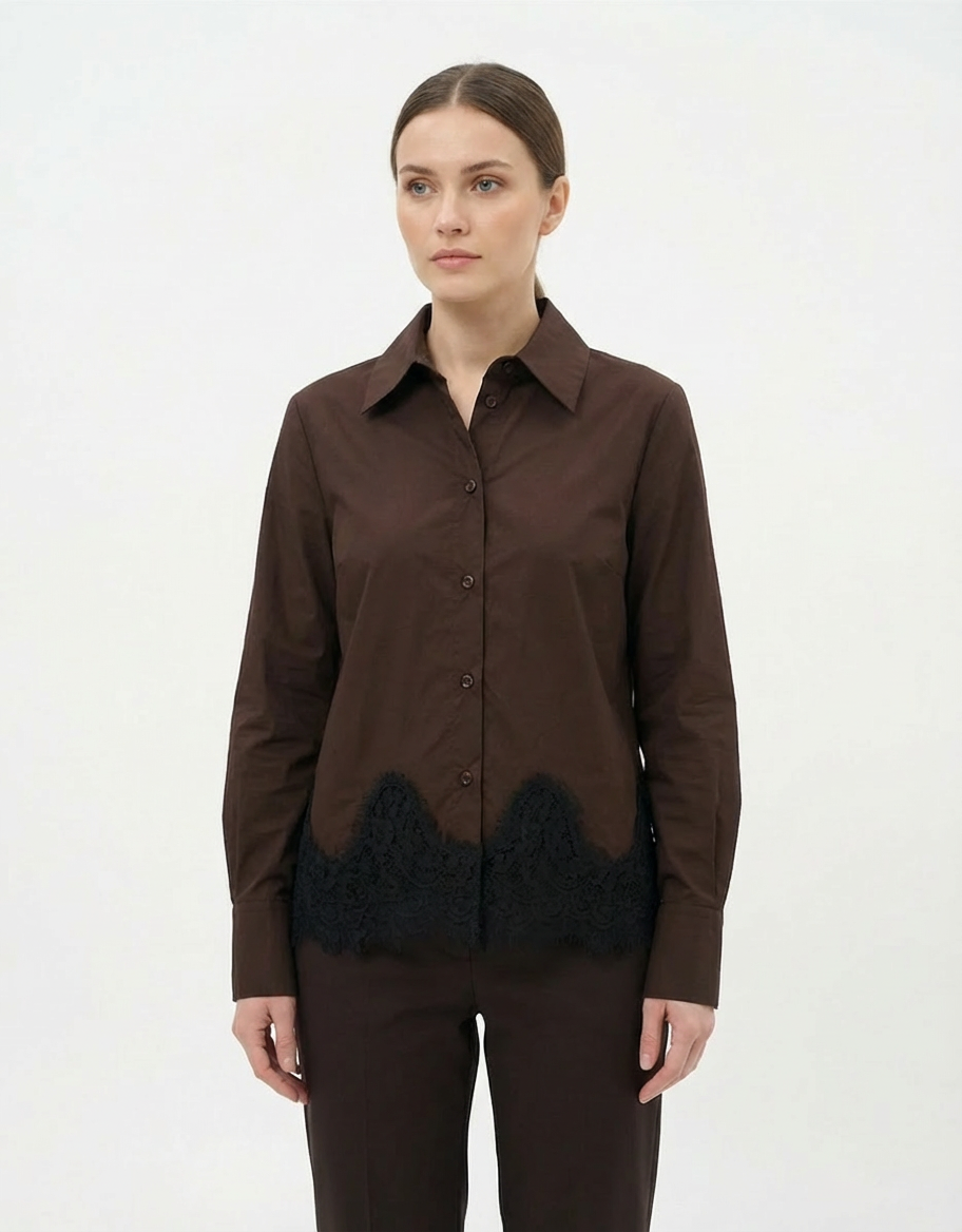 Blouse Roxy is een stijlvolle, vrouwelijke blouse in een warme bruine tint met een verfijnde zwarte kanten boord aan de onderzijde.