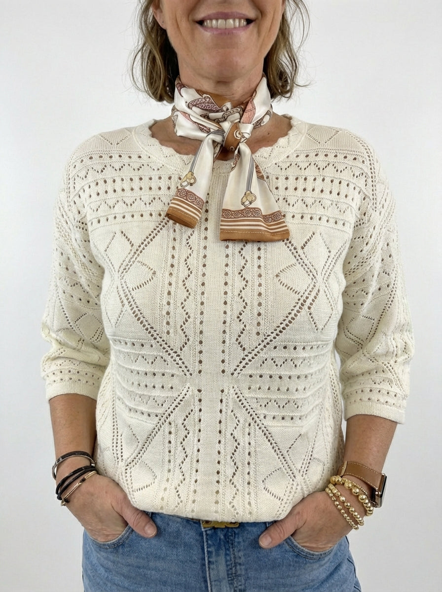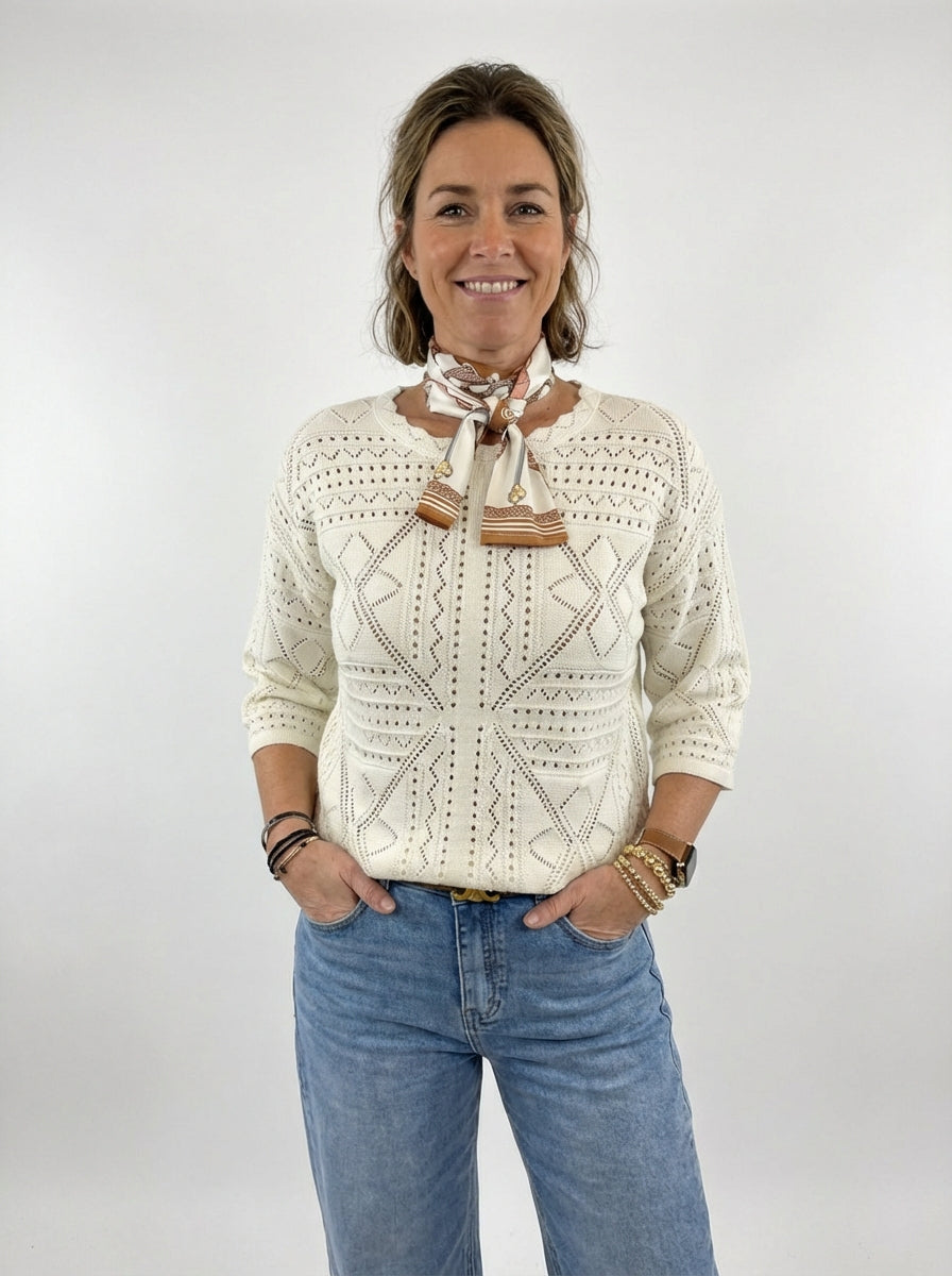 Trui Gea is een comfortabele en stijlvolle trui, gemaakt van 100% katoen en uitgevoerd in een ajour breisel.